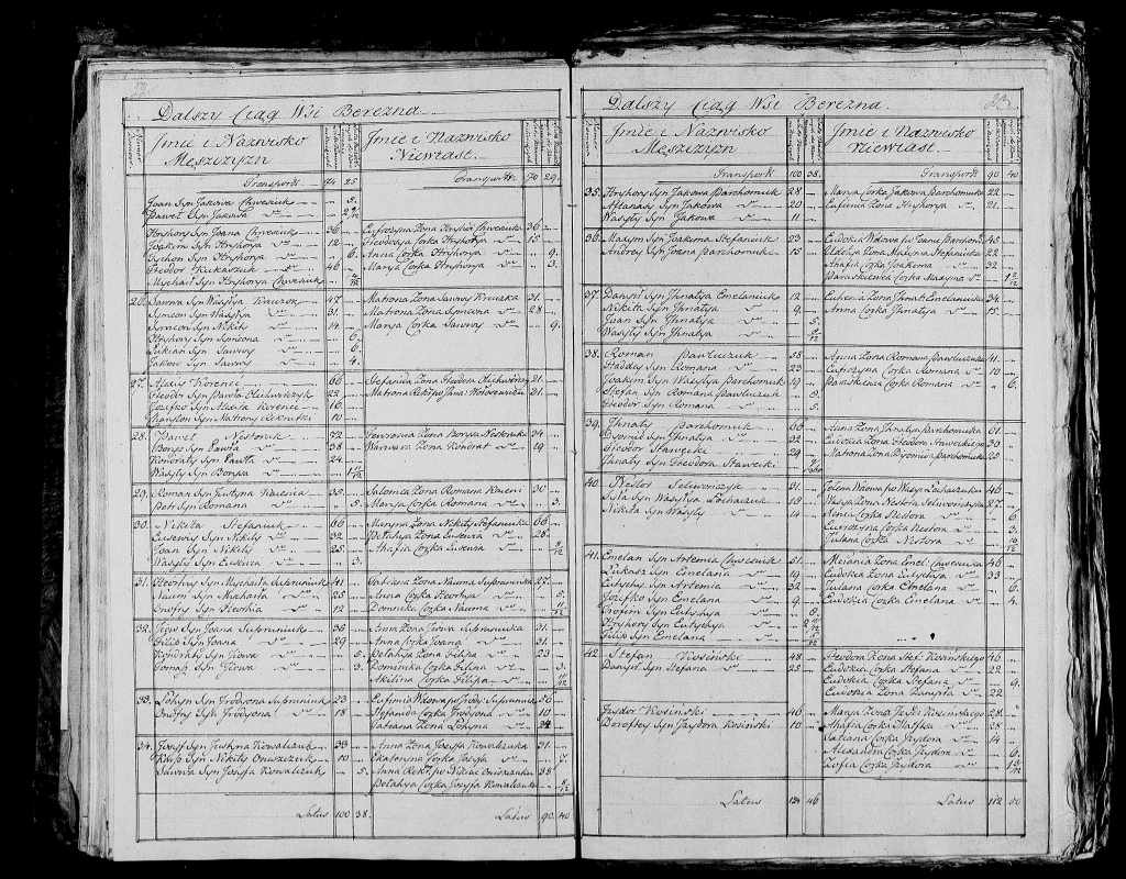 In 1824, the Greek Catholic Church, a Byzantine denomination in communion with Rome, carried out a census of parishoners in Grodno. The pages above are from the census in the hereditary village (“wieś dziedziczna”) of Berezno. There was serfdom at this time in Russia, as there had been in the commonwealth before partition, so the village (and its peasants) were owned by the local lord, and thus was “hereditary.” The serfs were tied to their villages and the land, with limited rights to live or marry outside them, and with little religious freedom.