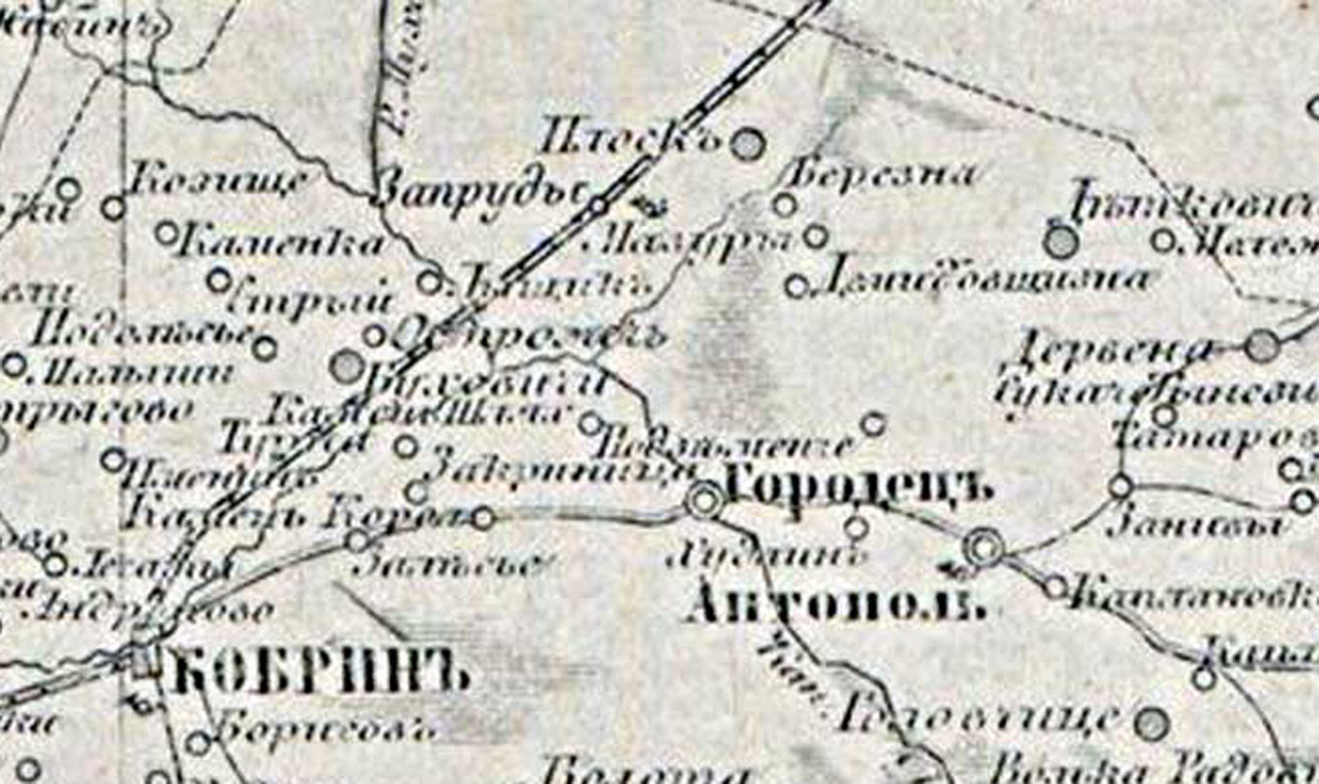 In the 1871 Russian map of the Grodno Province above, Berezno appears as “Berezna,” written in Cyrillic as Bерезна (look for it!). The village is situated about 15 kilometers northwest of Antopol (Антопаль), the local market town, and about 30 kilometers northeast of Kobryń (Кобрын), the closest city. In the southwest of the Grodno Province on the River Bug, about 70 kilometers to the west of Berezno, lies the historic border city of Brest-Litovsk (Брест-Литовске). Much of Walter’s early story occurs in and around these locations.