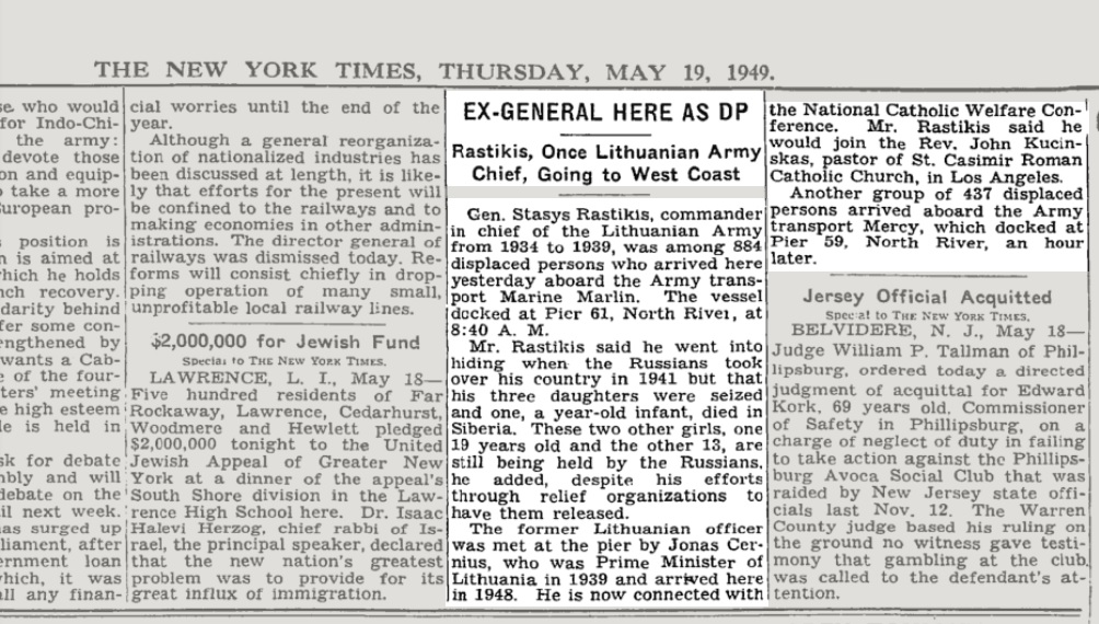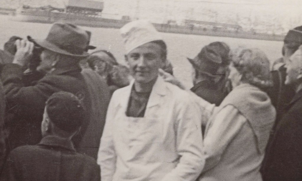 May 8, 1949 — The Parfomuk family sailed from Bremerhaven, Germany on a U.S. Navy troop ship, the USAT Marine Marlin, bound for New York. Their emigration to the United States was made possible by the The Displaced Persons Act of 1948, signed by President Truman, which allowed 200,000 European DPs into the United States. All the Parfomuk family members appear on the passenger list above for the Marine Marlin, which carried 884 displaced persons altogether. Wladyslaw Parfomuk volunteered for mess hall duty serving food on the voyage. In the picture above, he is standing on deck in his mess hall uniform as the ship sails by the cliffs of Dover, England. The Marine Marlin docked at Pier 61 in Manhattan (Chelsea) at W. 21st Street on May 18, 1949 at 8:40 in the morning. The New York Times article above reports the ship’s arrival.