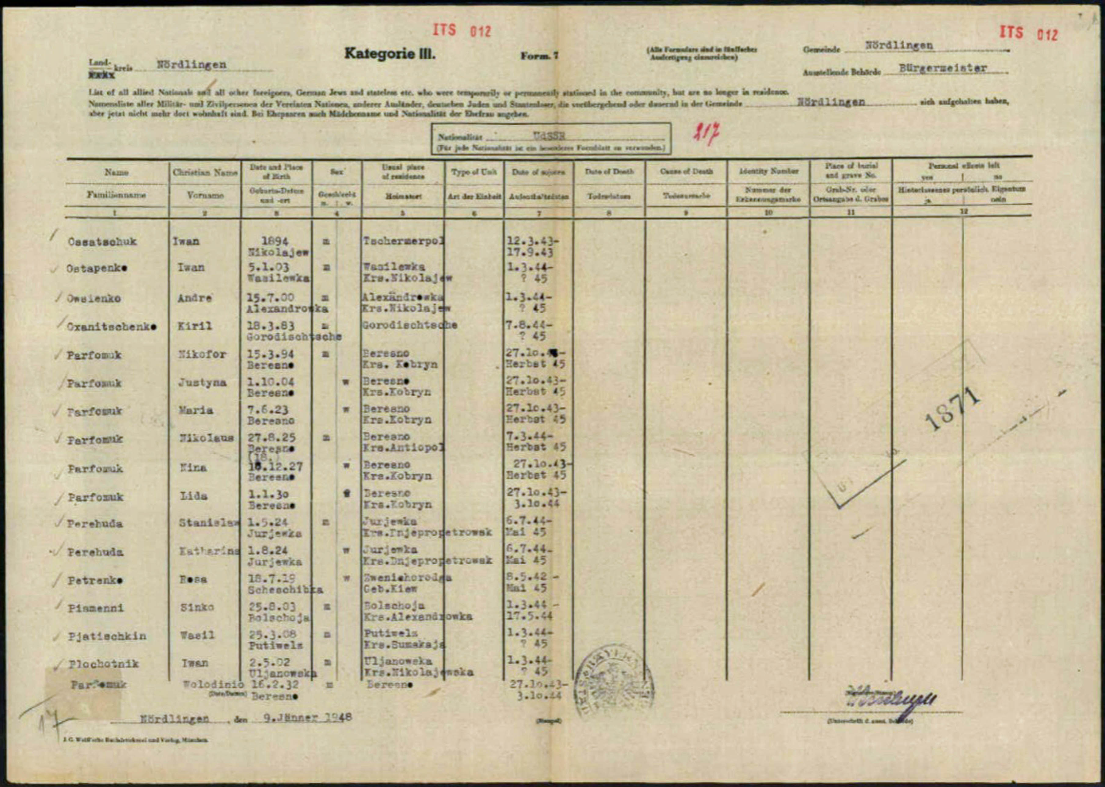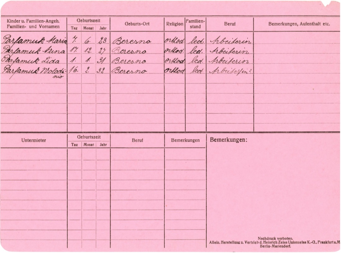 October 27, 1943 — After spending two weeks in a German processing facility where destinations were assigned, the Parfomuk family (except Mikolaj) finally arrived in Nördlingen, a small city in Bavaria (southern Germany) about 1,300 kilometers from Berezna. A beautiful, historic city, Nördlingen is one of only three cities in Germany completely enclosed in medieval walls. The German registration document above lists the family members and their date of arrival (zuzug).