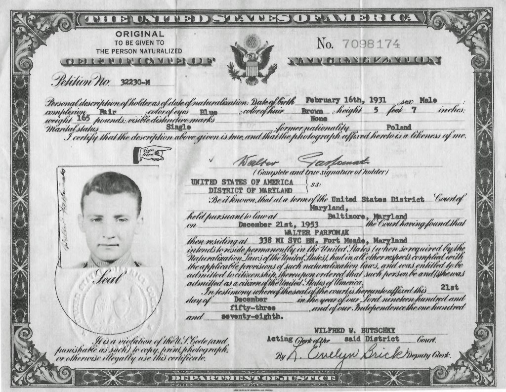 December 21, 1953 — During his Army enlistment, Władysław Parfomuk became a naturalized U.S. citizen, changing his name to Walter Parfomak in the process. Walter benefitted from a law Congress passed in June 1953 providing for expedited citizenship of immigrants who were serving on active duty in the U.S. armed forces during the Korean War.