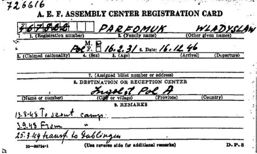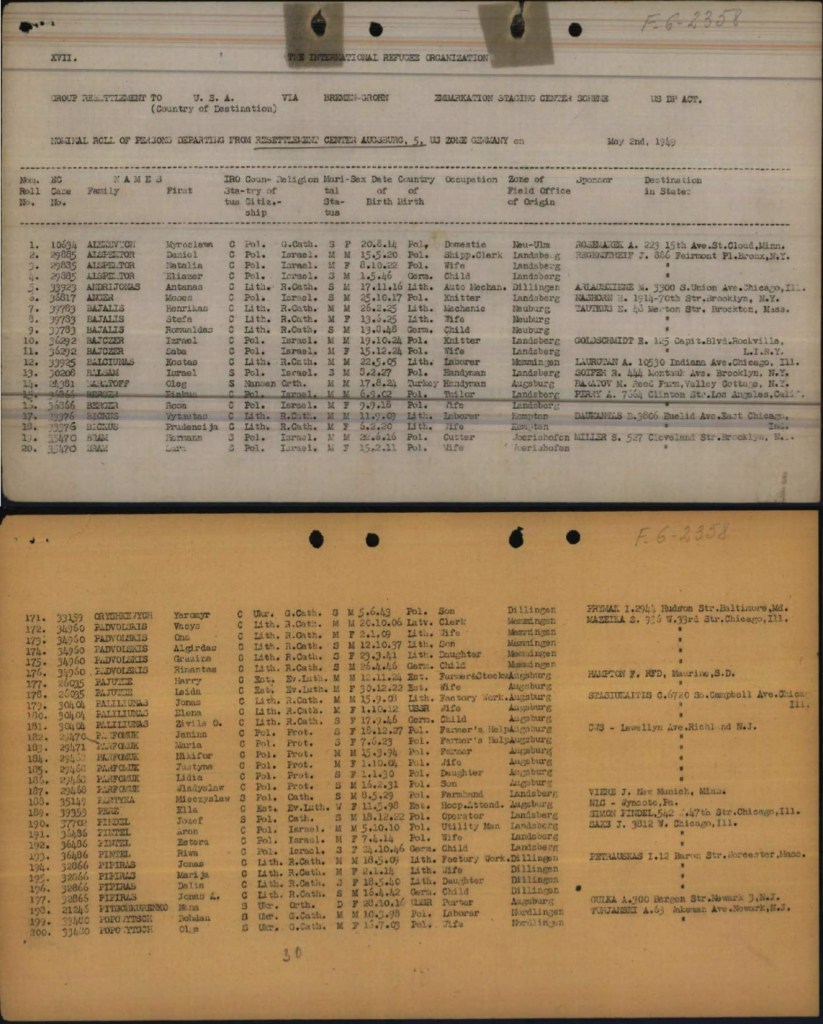 The Parfomuk family left Augsburg for the IRO Center at Camp Grohn in Bremen, which was a staging camp for DP emigrants. According to another account, at the camp, DP’s were prepared for their emigration by having vaccinations and medical exams. They also were required to watch films about what to do in the camp and attended two-day information sessions about life in the United States, including sessions about becoming a citizen, American history, government, customs, employment, money, and weights and measures. Emigres remained at the camp until the day of their ship’s departure, when they would board a train for the short trip to the port.