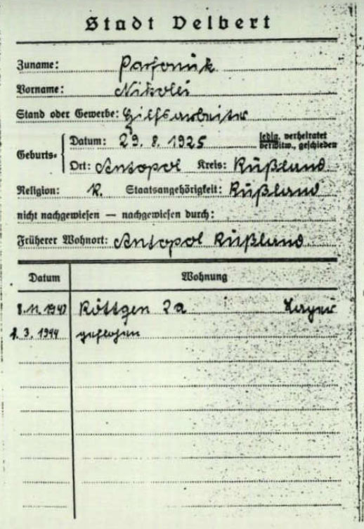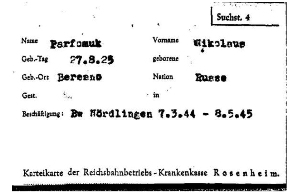 Although he was assigned to labor in Velbert, in March 1944, after four months working in Velbert, Mikołaj decided to rejoin the rest of the family. Without permission, he risked traveling by rail across Germany to Nordlingen, where he presented himself to the local officials. Although the Velbert authorities asked for him to be returned, the Nordlingen officials allowed him to remain at the rail yard (“Well, he is already here”). Mikołaj seems to have avoided punishment for his illegal travel and transfer.
